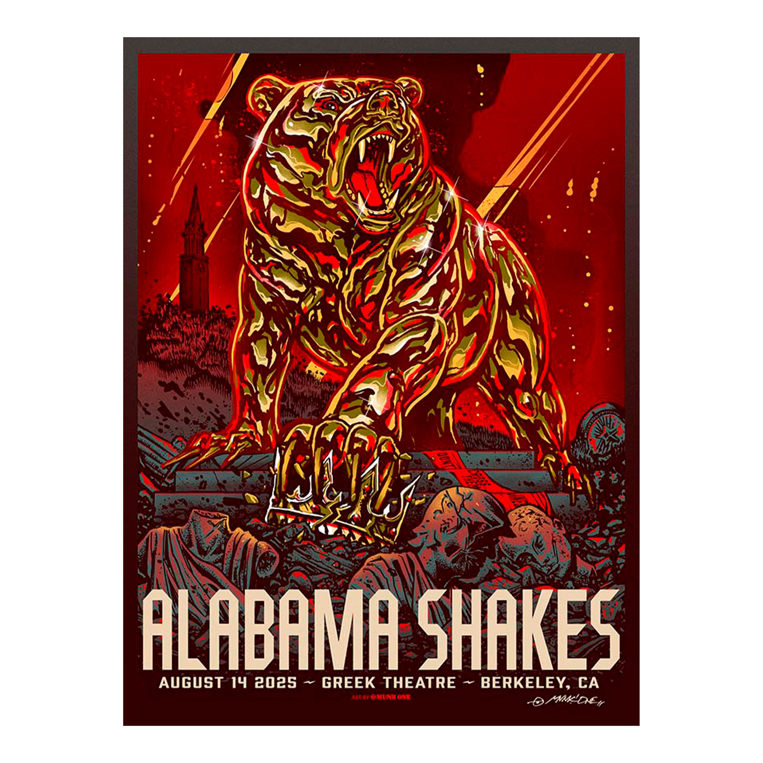 Official Screen Printed Poster for August 14, 2025 in Berkeley CA. Art by Munk1.